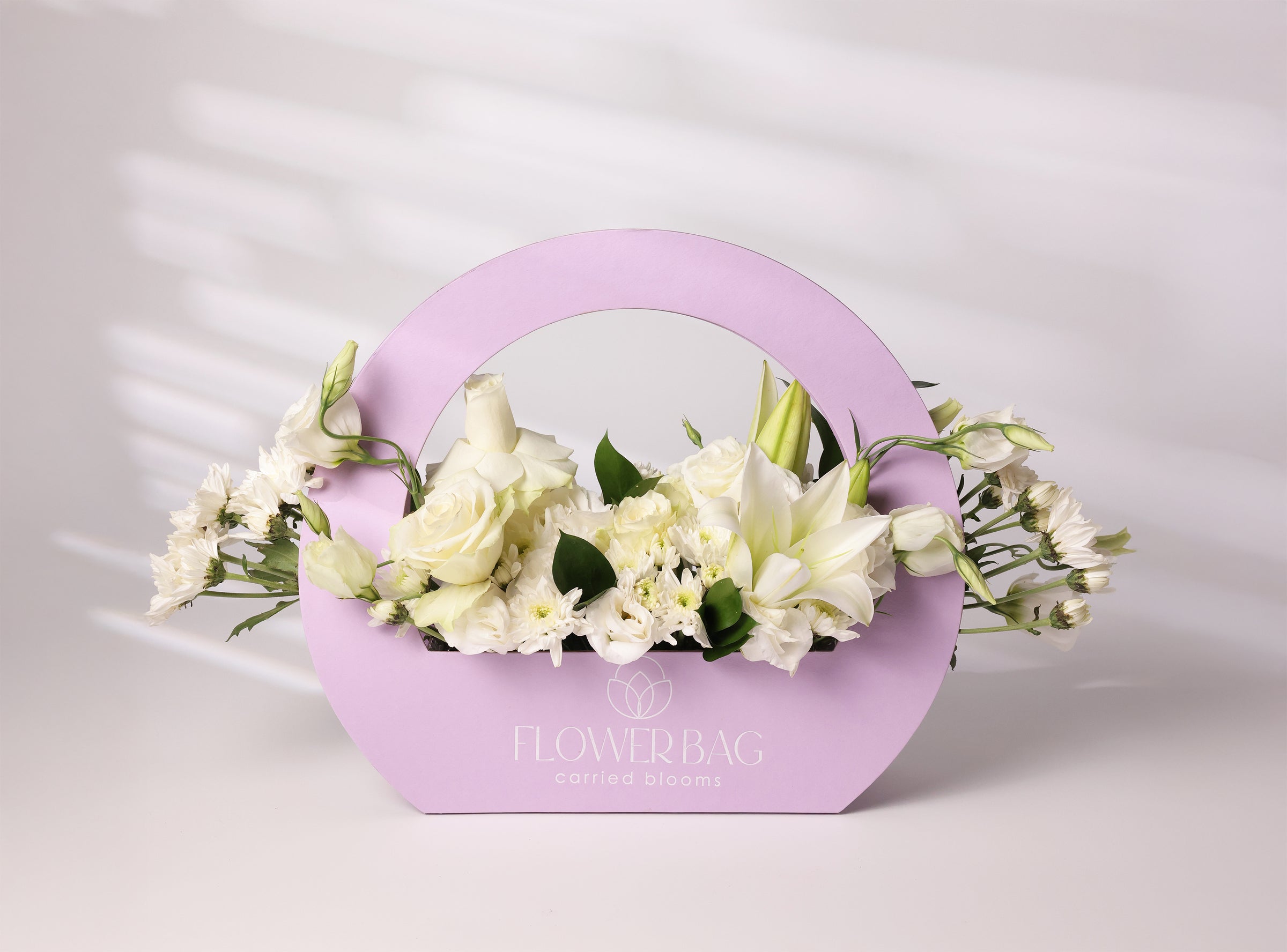 Angel's Helmet is a graceful harmony of pure white blooms, featuring 3 white roses, half a pack of eustoma, 1 pack of white chrysanthemums, 1 stem of white lily, 2 stems of ruscus, and 1 sponge, beautifully arranged in a cardboard handbag to create a serene and timeless gift.