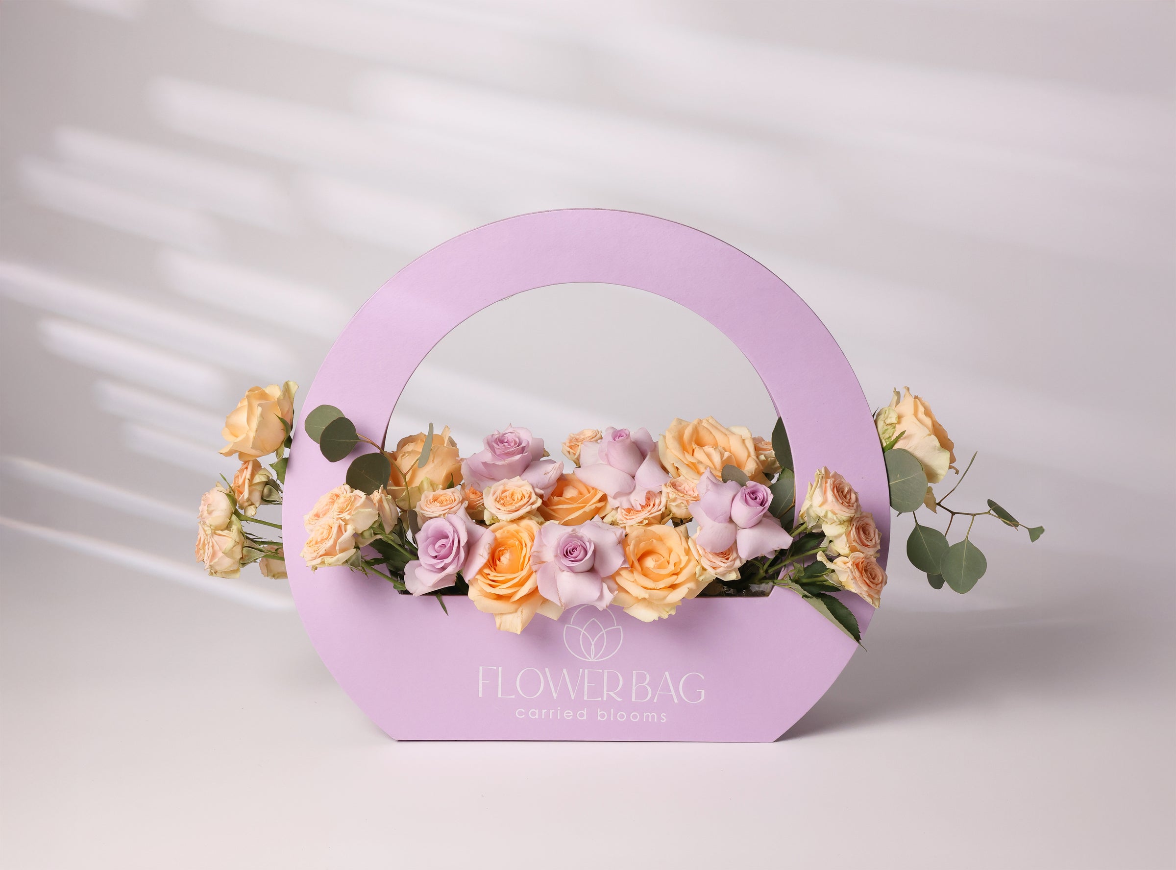 Orchard Flowers By My Side blends peach and lilac tones in perfect harmony, featuring 6 peach roses, 5 lilac roses, 1 pack of peach baby roses, 1 stem of eucalyptus, and 1 sponge, gracefully arranged in a cardboard handbag to create a sweet and enchanting gift.